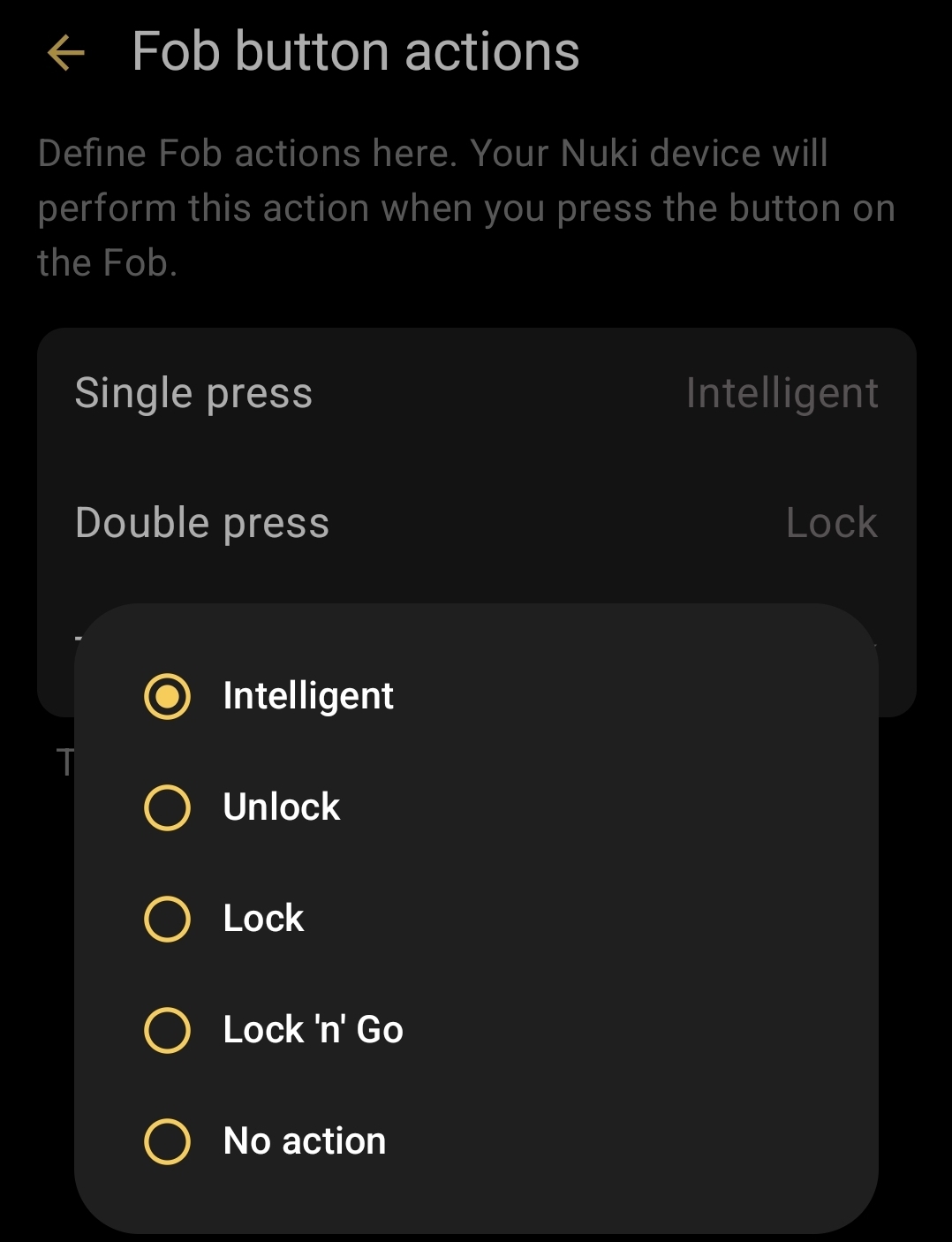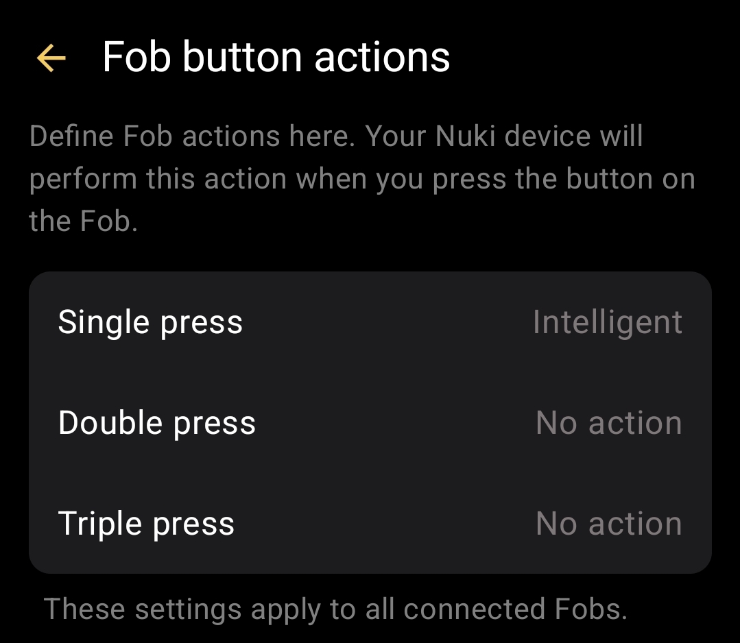 If you want to have an “Open Door” directly from the “Unlocked” state with a Fob, currently you need to have the door fitting setting as previously describe and the Fob Action should be set to “Unlocked”.