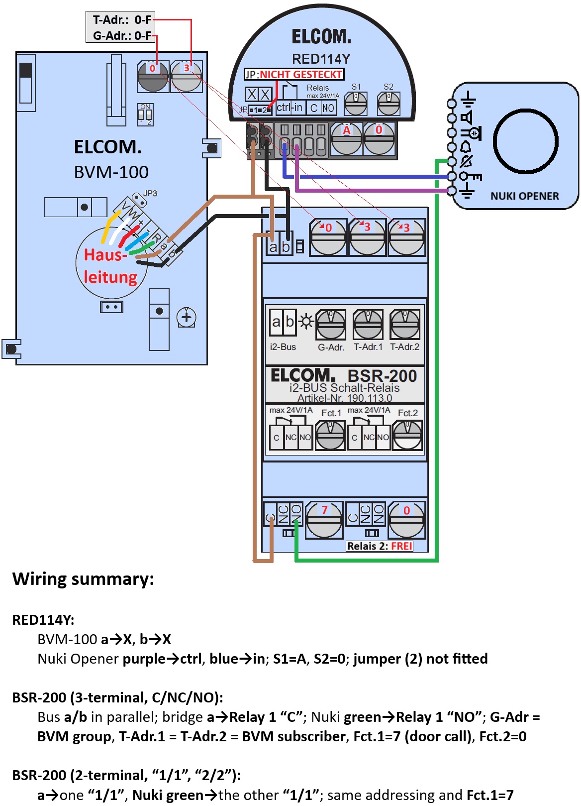 - RED114Y: BVM-100 a→X, b→X; Nuki Opener purple→ctrl, blue→in; S1=A, S2=0; jumper (2) not fitted.