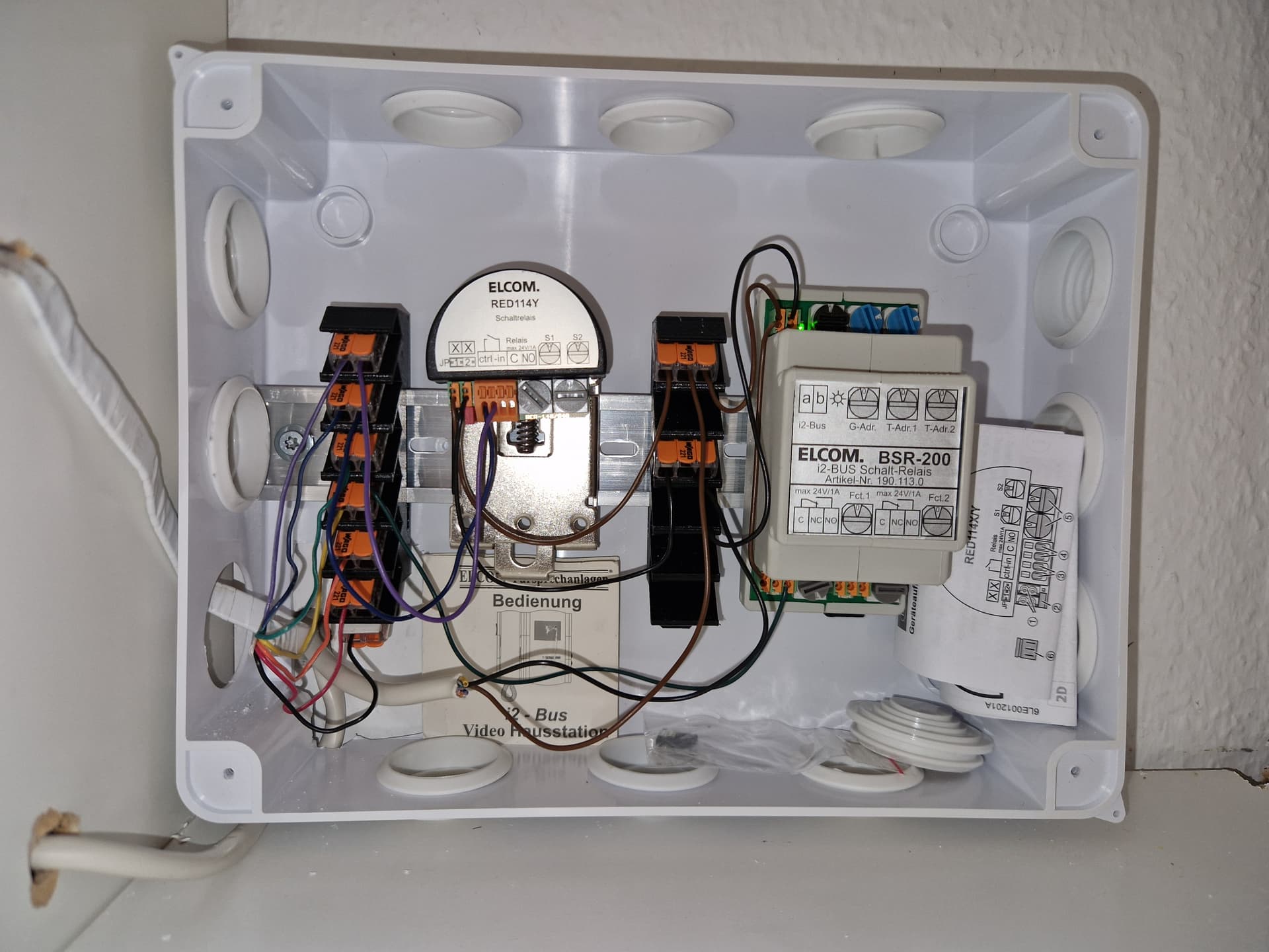 I branched the intercom a/b lines directly at the house entry using Wago connectors, and routed the Nuki Opener wires into a Wago as well. The BSR-200, RED114Y, and the Wago blocks are mounted on a DIN rail inside a large junction box. Works cleanly and is service-friendly.