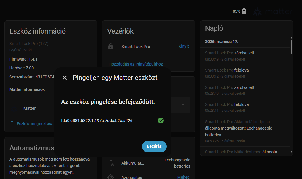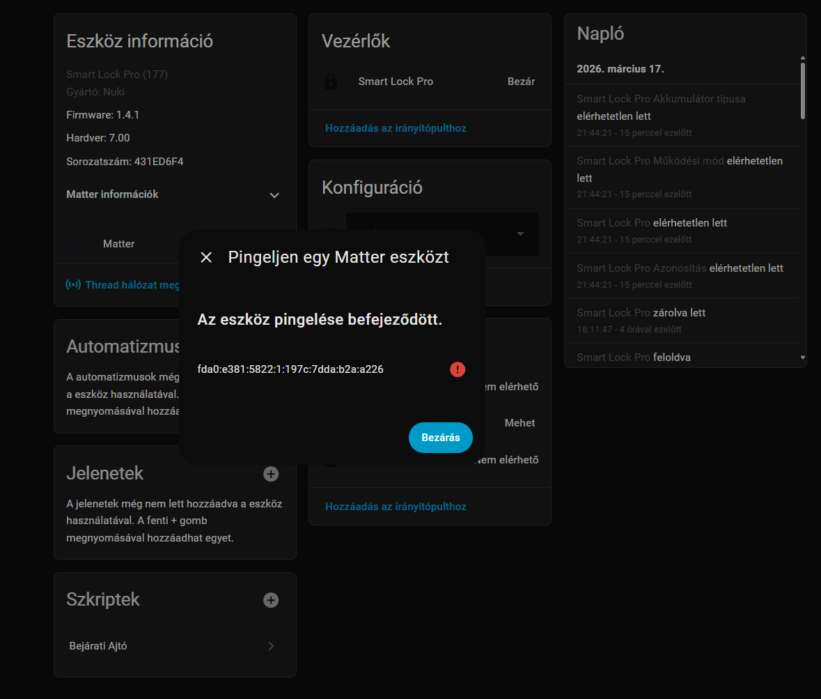 Because restarting Home Assistant’s Matter/Thread services does not recover it, this does not look like just a Home Assistant service issue. It looks more like the Nuki Matter/Thread stack becomes unresponsive or stuck after some uptime.