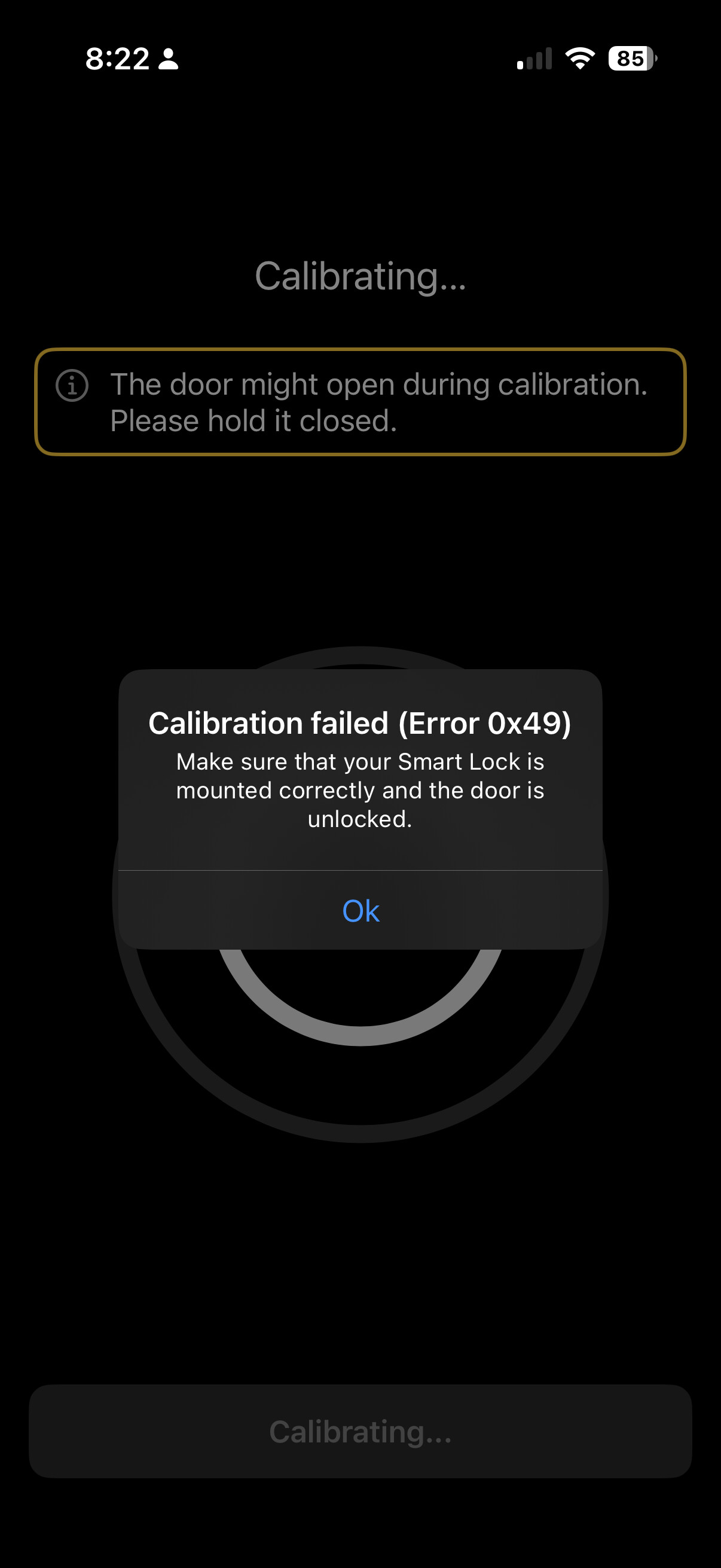 I seem to have a problem recalibrating. I have followed the onscreen instructions but I keep getting the same error code 0x49 see attached. I have tried new batteries and get the same - the mechanism just will not turn and flashes red light. I have left the battery pack out for 20 minutes and still get the same when trying to calibrate. I am now stuck with a dead lock